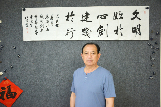 “在‘两城同创’工作中,我们协会将会组织全体成员进入小区开展笔会交流活动。作为一个书法爱好者,我愿意义务教业主们书写毛笔字,用书法帮助他们陶冶情操,提升他们的精神文明素质。我们还会现场书写一些助推‘两城同创’工作的标语,为创建工作尽一份自己的力量。”江从道拿出了一副刚刚书写好的字画,“文明始于心,创建践于行。希望全体市民能从创建的旁观者变为参与者,用实际行动助推‘两城同创’。我愿意为我县创建工作尽上自己的一份力,在精神文明宣传上起到带头作用。希望我县市民共同配合,共同促进,打好‘两城同创’这一仗。”江从道最后说。