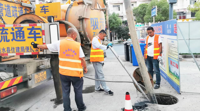 为确保金城路慢车道改造工程顺利实施,近日,县住建局便民公司组织人员对金城路雨污管网进行全面疏通。图为施工人员正在金城路与北大路交叉口进行疏通。