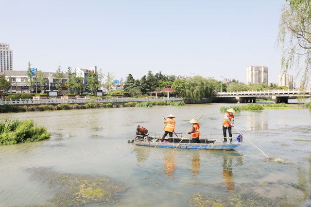 县水利局河道保洁人员每天在河道上驾船穿梭,打捞浮萍及各种水上漂浮物,不放过水面上任何一个角落,让天蓝水更净。图为河道保洁人员在涟河上打捞漂浮物。