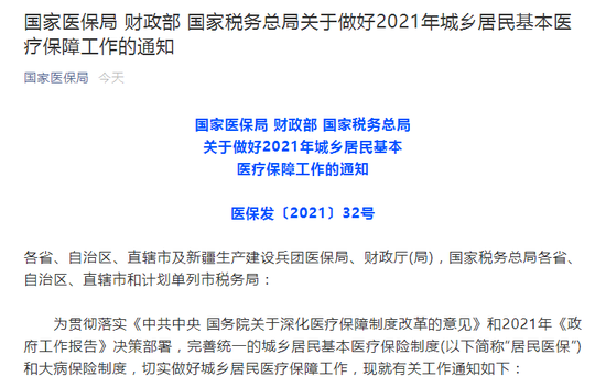 国家医保局财政部国家税务总局关于做好2021年城乡居民基本医疗保障工作的通知
