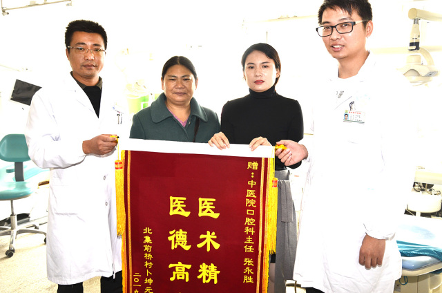 10月21日上午10点左右,县中医院门诊前举着印有“医术精湛 医德高尚”锦旗的一对母女引起了人们的围观,大家纷纷询问:“是不是送锦旗的啊?”“送给谁啊?”母亲掩饰不住高兴,大声回答:“送给中医院口腔科的张永胜主任,他看好了我的病……”母女俩在众人的簇拥下来到了该院口腔科,满怀感激地将锦旗送给了正在忙碌的张永胜主任,同时感动地说:“真的太感谢张主任了,让我们少跑了多少腿,少花了多少冤枉钱。”