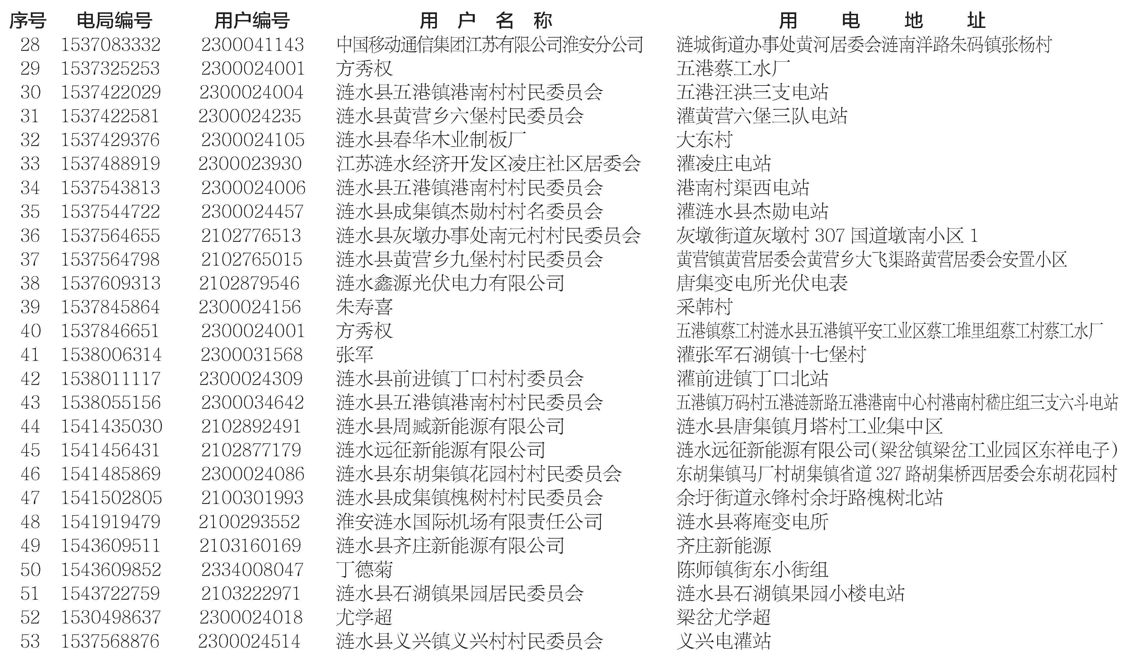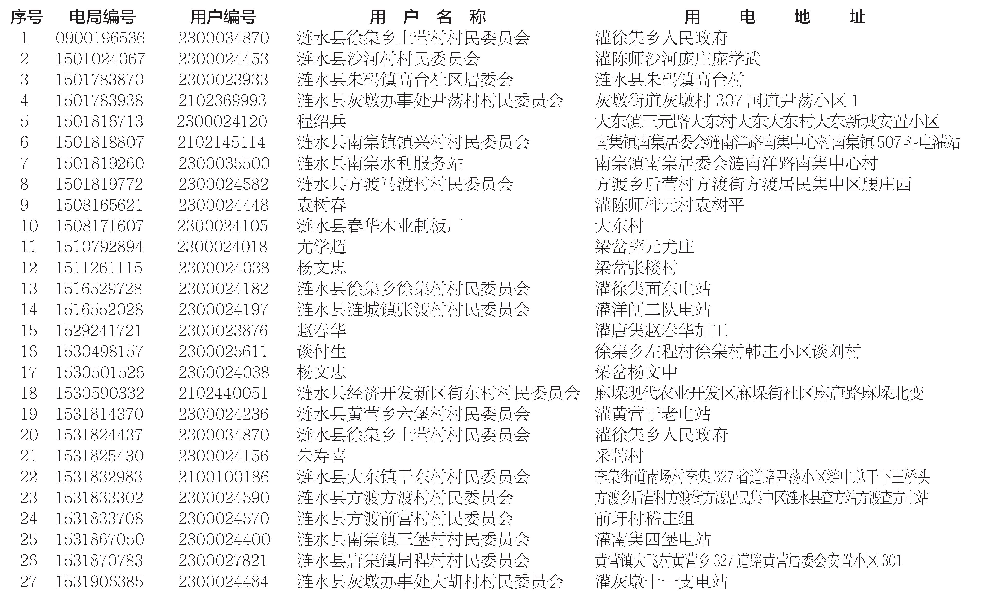 国网涟水县供电公司正在对连续六个月以上不用电用户进行销户及账户余额清退,请以下长期未用电用户携带用电主体资格证明(其中居民用户持房屋所有权人有效身份证明,非居民携带用电人有效身份证明及加盖单位公章的营业执照或非法人组织机构证明文件(统一社会信用代码等)),物业权属证明(包括房屋所有权证、土地使用权或其他证明文书),委托他人办理还需提供经办人身份证及授权委托书等相关材料于2025年10月21日前至涟水供电营业厅(安东路59-4号)及各乡镇供电营业厅办理销户手续。如用户需再次用电,请携带相关材料至属地营业厅进行新装用电申请。以下为长期未用电用户清单。