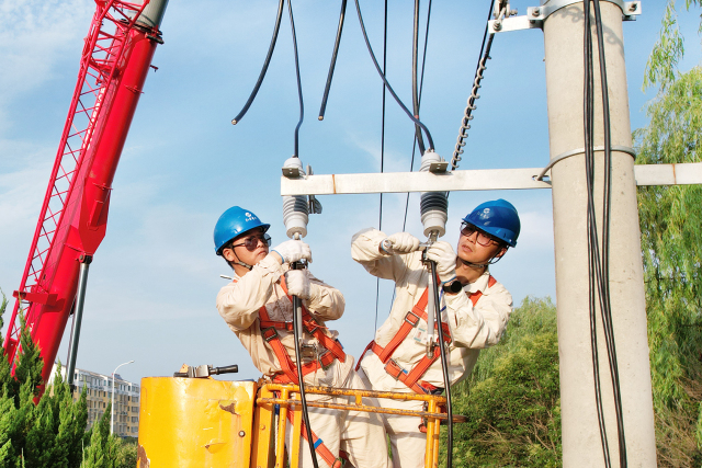 连日来,受持续高温影响,居民用电需求不断攀升,为保证辖区内用电安全可靠,国网涟水县供电公司组织人员对部分区域的线路设备进行升级改造。图为7月19日,施工人员在10千伏炎黄4号125线陶码支线6号杆搭接电缆接头。