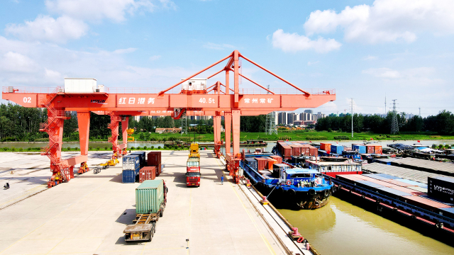 由上海郁州海运有限公司承运的209标箱货物,日前进入新扩建的淮安港涟水港区, 7月30日起转运连云港新云台码头,然后发往辽宁营口、福建厦门及泉州、广东汕头等地。图为涟水港区转运标箱现场。