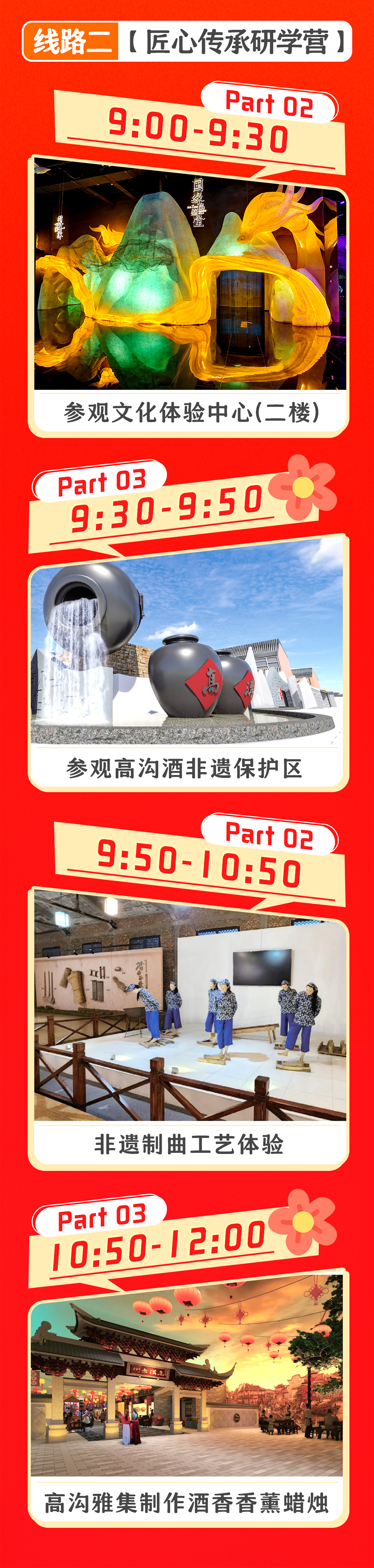 9:00-9:30:参观文化体验中心(二楼)→9:30-9:50:参观高沟酒非遗保护区→9:50-10:50非遗制曲工艺体验→10:50-12:00高沟雅集制作酒香香薰蜡烛