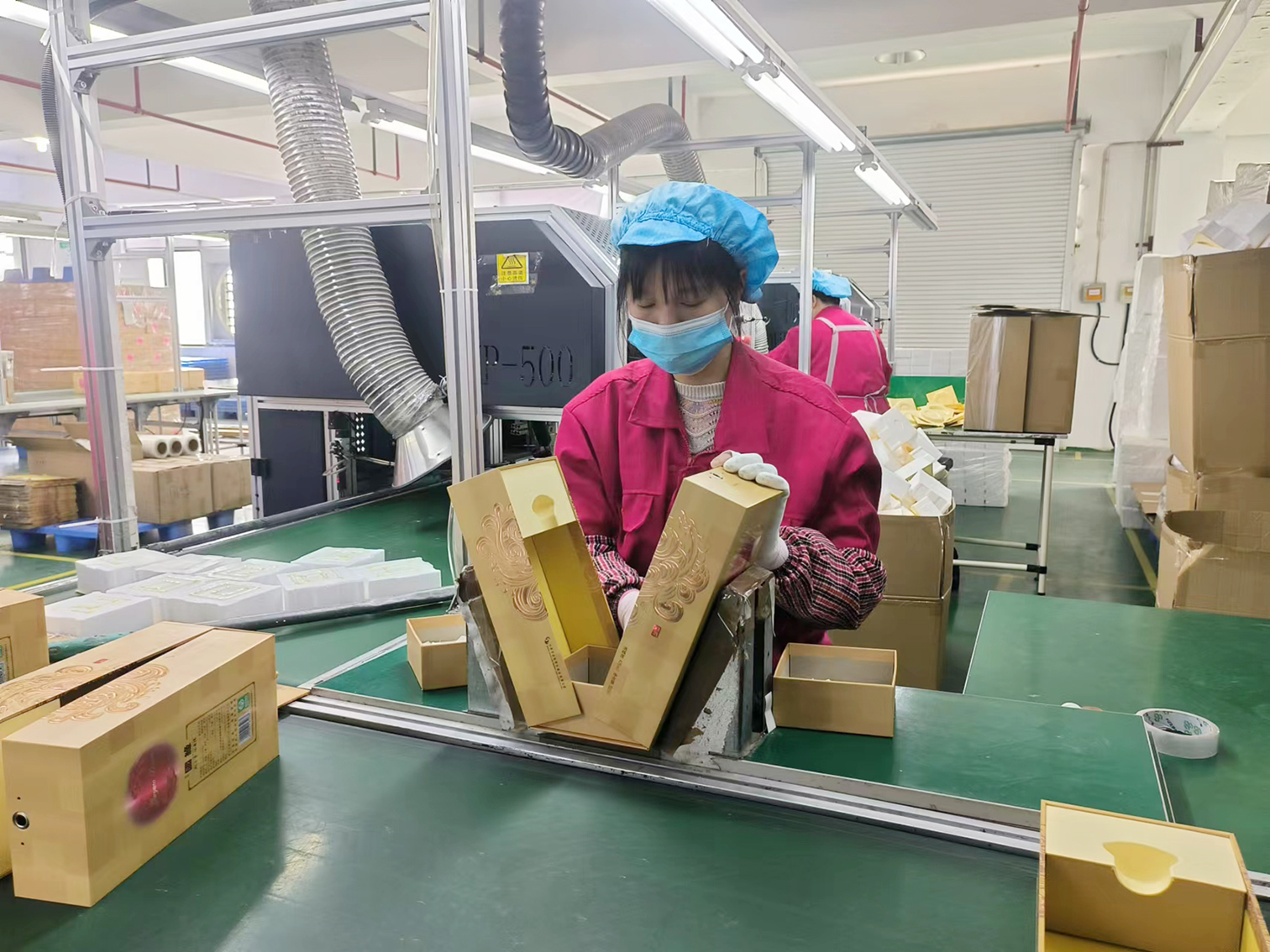 涟水美盈森智谷科技有限公司是一家集设计、生产、销售于一体的专业包装制品科技型中小企业,主要产品有酒类精品包装盒、高档礼盒,产品已广泛应用于酒类等行业。图为该公司忙碌的生产场景。