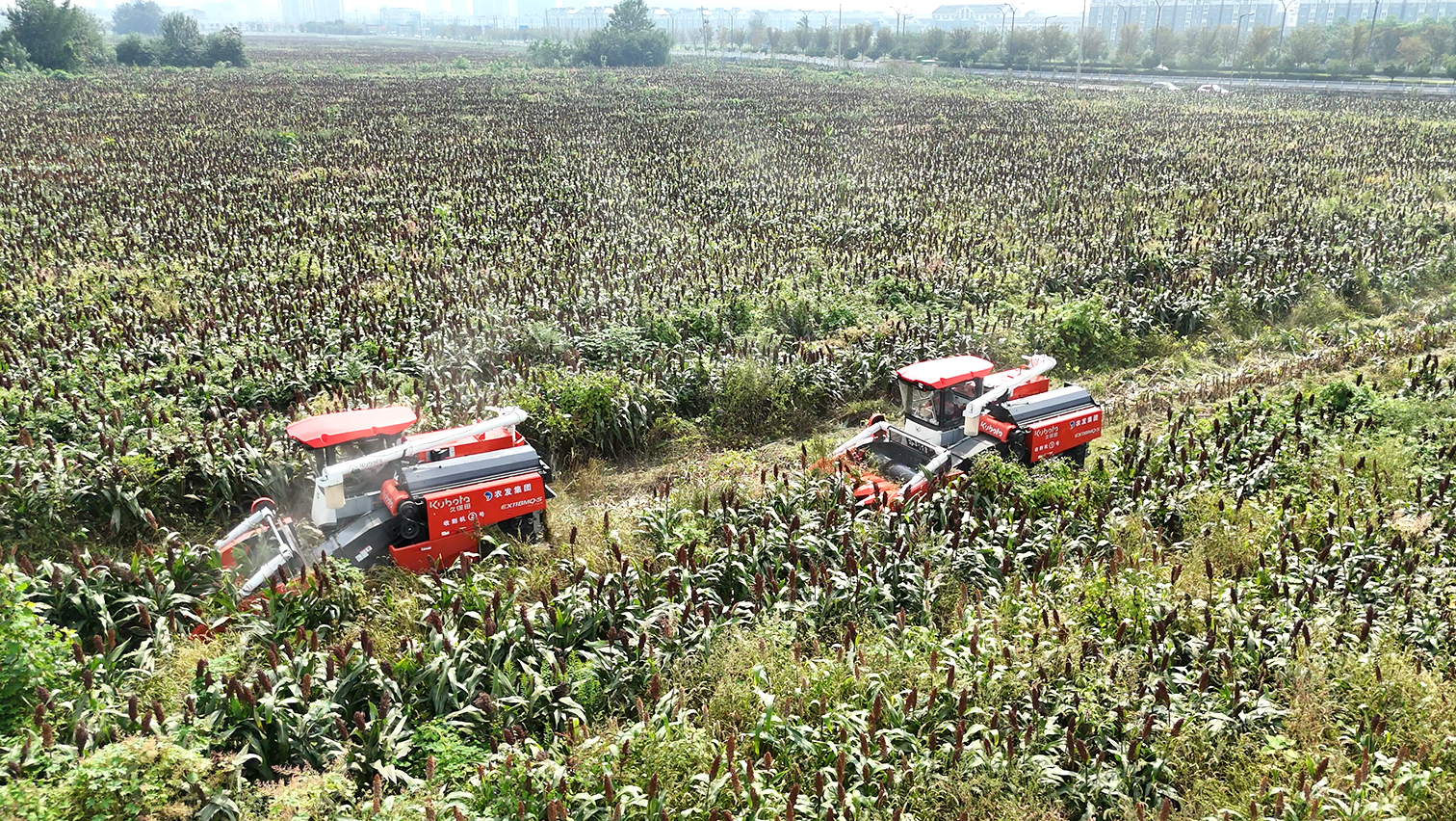 近日,涟城街道大关社区周边的田野里,一片片高粱泛起醉人的红晕,饱满的穗头织就了一片绯红的谷浪,收割机正在全力运转,轰鸣声奏响了丰收的乐章。