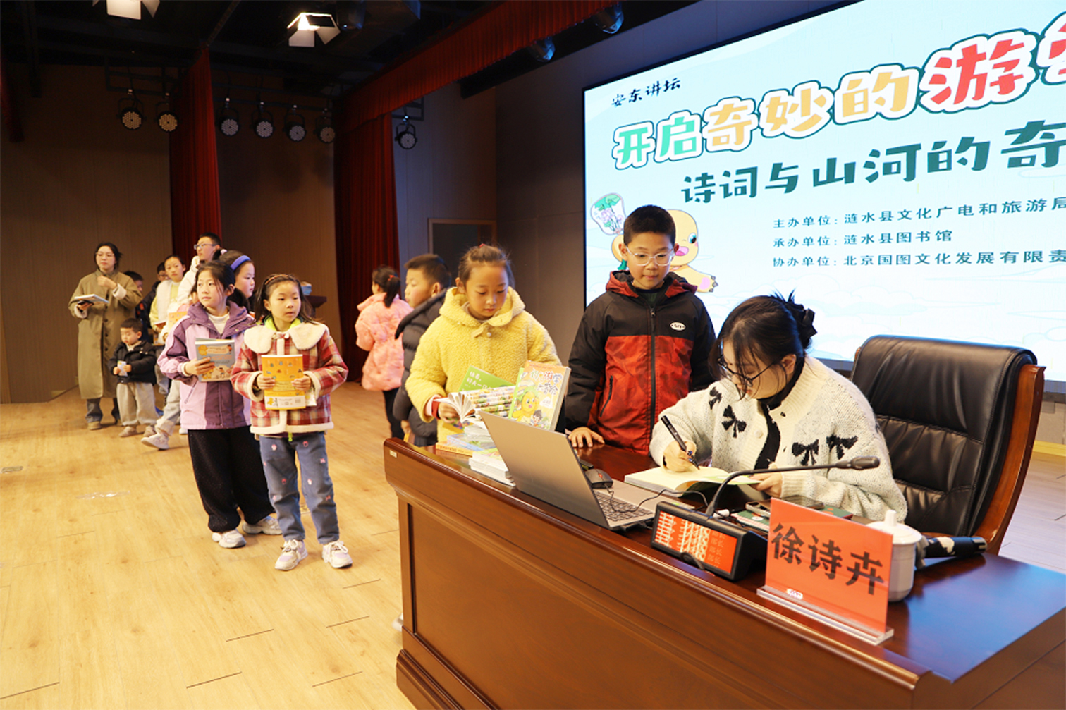 近日,县图书馆举办“奶龙游学大冒险:诗词与山河的奇幻对话”主题分享会。本次活动特邀奶龙漫画团队成员徐诗卉作为主讲嘉宾,围绕《奶龙游学大冒险:诗词篇》等系列图书,开展创作分享与文化交流。活动现场气氛热烈,通过生动有趣的讲解和沉浸式体验,让青少年读者对古诗词有了更深入的了解。图为徐诗卉为读者赠送书籍并签名。