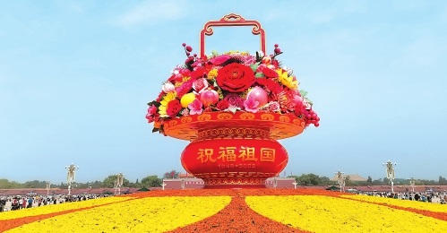 “祝福祖国”巨型花果篮亮相北京天安门广场