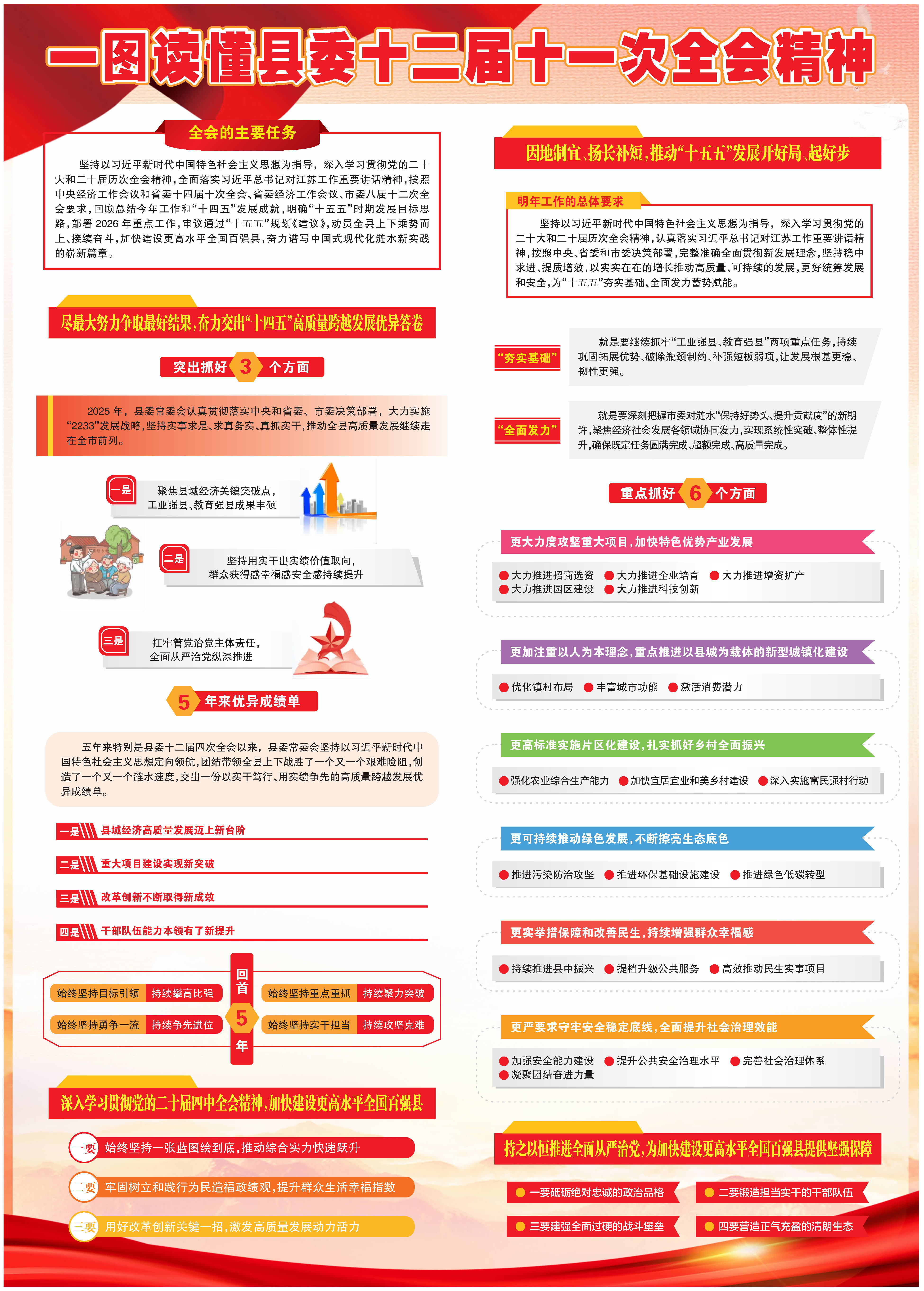 天寒人心暖,山高从头越。在全县上下乘着“十四五”完美收官的东风,向着“十五五”新目标阔步前行的关键时刻,我们迎来了县委十二届十一次全会的召开。会议圆满完成了各项预定议程,我们对全会的胜利闭幕表示热烈祝贺!这次全会开启了高质量跨越发展的新征程。会上,县委书记洪然作了讲话,...